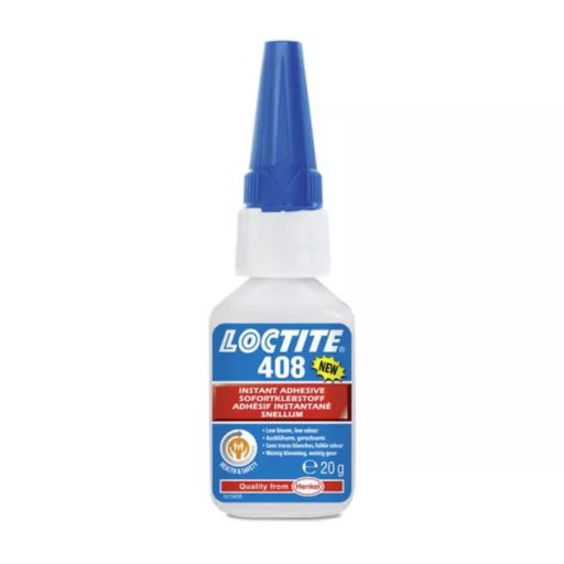 A Loctite 408 egy átlátszó, színtelen, alkoxi-etil-cianoakrilát pillanatragasztó, amely a szorosan illeszkedő felületek között nagyon gyorsan megköt. A termék műanyagok és a Loctite 770 vagy Loctite 7239 primerrel együtt alkalmazva poliolefinek ragasztására is alkalmas. Ezenkívül jól használható fémek, gumik, porózus és/vagy nedvszívó anyagok ragasztására is.