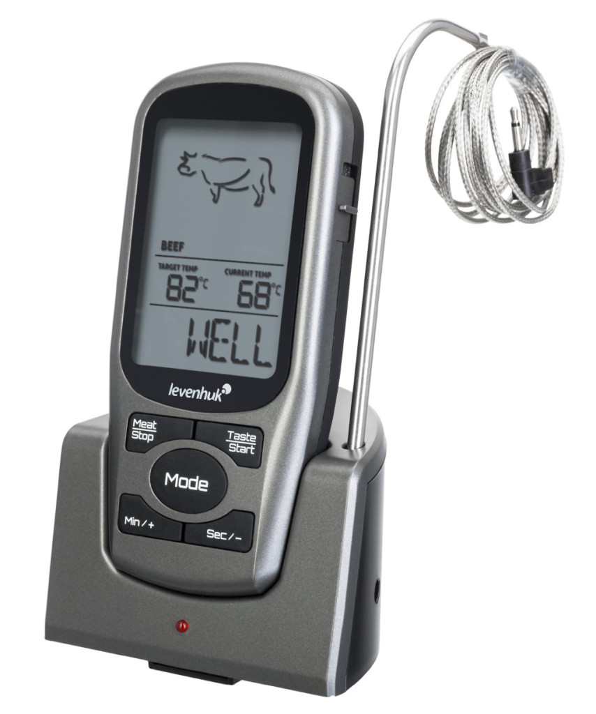 A Levenhuk F30 vezeték nélküli hőszonda a húsokkal való precíz munkához készült. Legizgalmasabb funkciója a hústípus kiválaszthatósága és az átsültség mértékének beállítása. Ezáltal tökéletesre sült ételeket készíthet különösebb erőfeszítés nélkül. A készülék időzítővel és a hőmérsékletszintet jelző hangjelző funkcióval is rendelkezik.