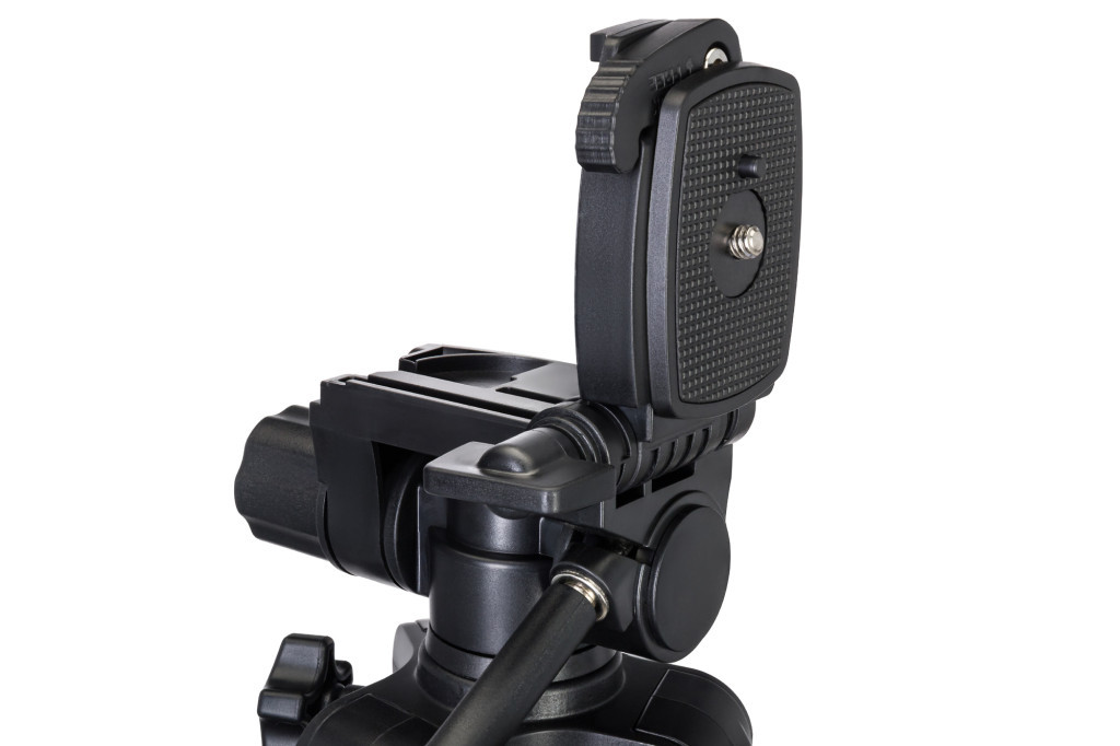 A fejrészen egy platform található, amely 90°-ig billenthető. A fejrész ezenfelül 360°-ban forgatható, valamint felemelhető, illetve leereszthető. A háromlábú állvány összes tengelyén rögzítőgombok találhatók. A szabványos 1/4" menetnek köszönhetően csaknem minden korszerű készülék felszerelhető rá. Felhívjuk szíves figyelmét, hogy bizonyos eszközök esetében a felszereléshez adapter (nem része a készletnek) kellhet.