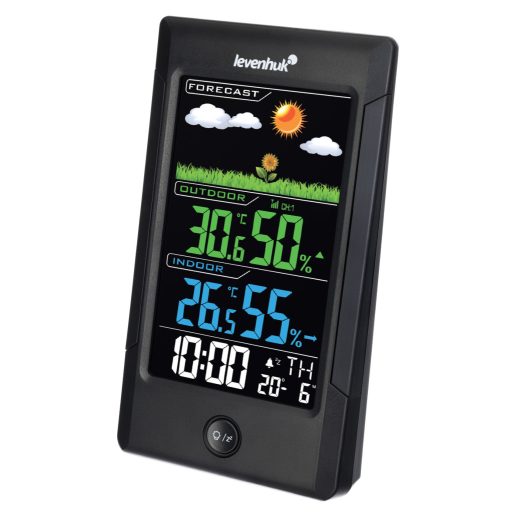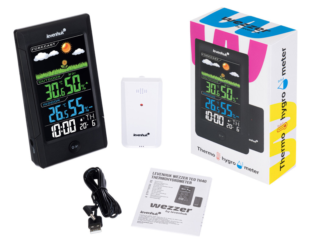A Levenhuk Wezzer Teo TH40 hőmérséklet- és páratartalom-mérő készülék bármelyik otthon és iroda stílusos eszköze. Kontrasztos, hátsó megvilágítású, színes kijelzővel rendelkezik, és vezeték nélküli hő- és páratartalom-érzékelővel van felszerelve, amelyet a fő egységtől akár 80 méteres távolságban is el lehet helyezni. A hőmérséklet és a páratartalom mérése mellett a berendezés az időt, a hét napját, az időjárási trendet és az időjárási előrejelzést is kijelzi. Ébresztőóra is található benne, szundi funkcióval.
