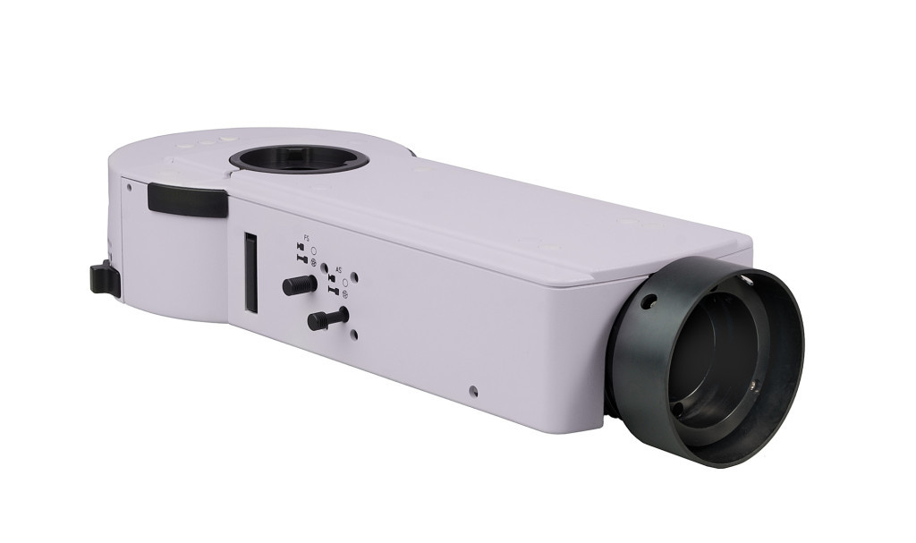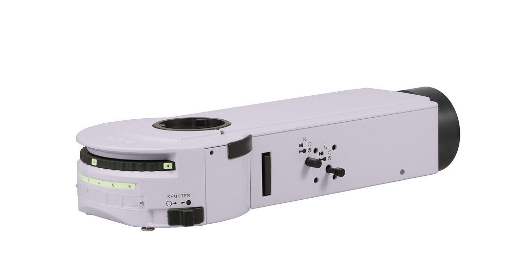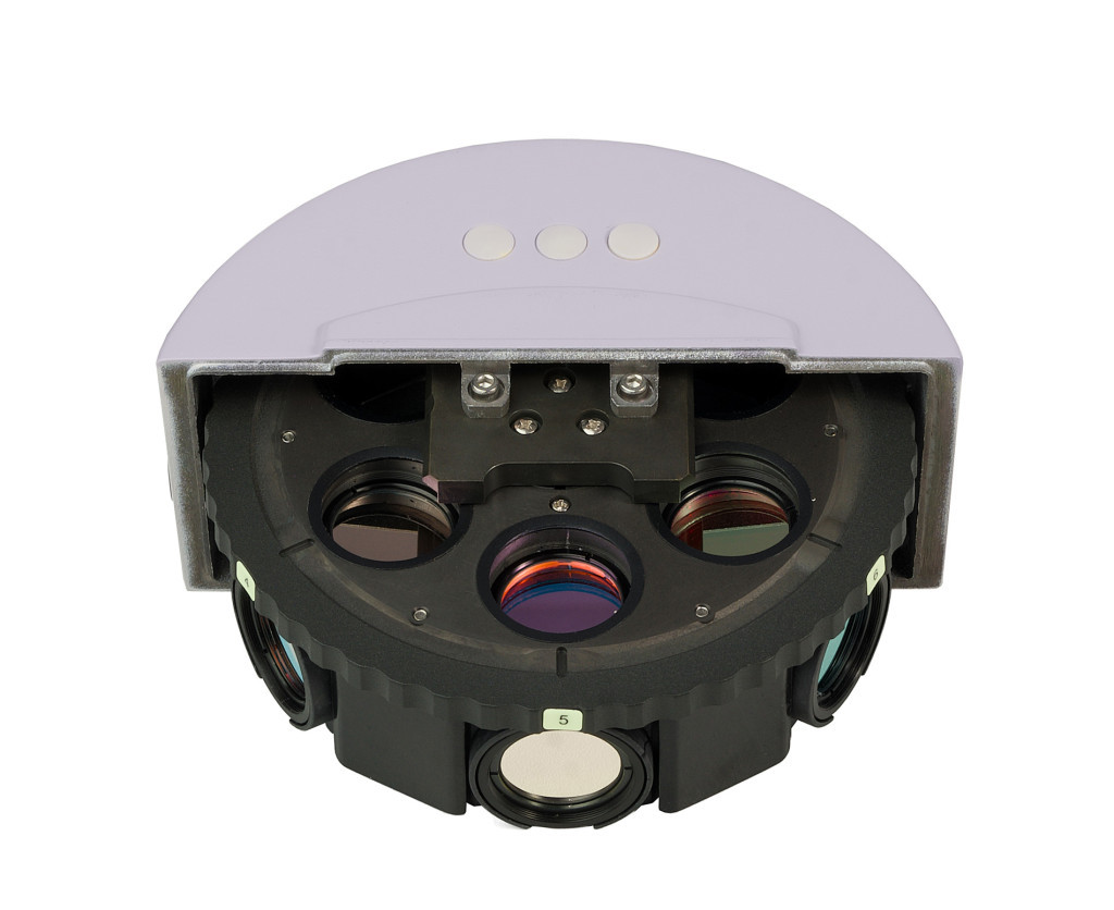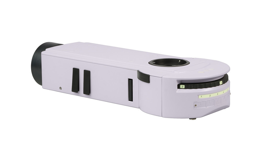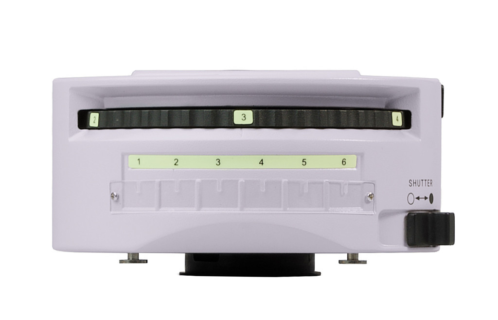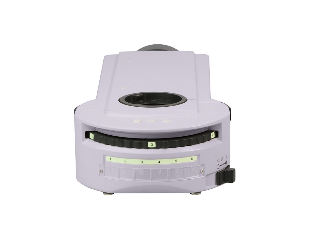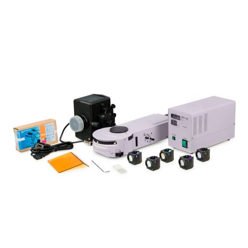 A tartozékot a mikroszkópfej és az állvány közötti fényútba szerelik. A tartozékban 6 állású forgótár van fluoreszcens szűrőkkel. Egyszerre öt fluoreszcens szűrőkocka van felszerelve a forgórészre (a felhasználó által választható). A kívánt szűrő a gyűrű elfordításával behozható a fény útjába. A tár egyik állása a világos látóterű megfigyelésnek felel meg. Az oldalsó gombok a mező- és apertúrarekesz nyílásának beállítására szolgálnak. A fluoreszcencia szűrőkockák készlete különböző hullámhosszúságú fluoreszcencia szűrőket tartalmaz: széles sávú kék (В), zöld (G), ultraibolya (UV) és keskeny sávú vörös (R), és keskeny sávú szűrőket a DAPI, FITC és TRITC fluorokrómokhoz.