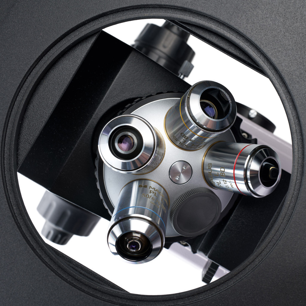 A vizsgált minta alatt 5 objektíves forgatható tárgylencsefoglalat helyezkedik el. A mellékelt objektívek beszereléséhez 4 hely áll rendelkezésre, valamint egy másik hely egy további objektív beszereléséhez. A mikroszkóp minden objektívje BD feliratú, azaz kifejezetten világos látóterű és sötét látóterű mikroszkópiához tervezték őket és nagy munkatávolsággal rendelkeznek.