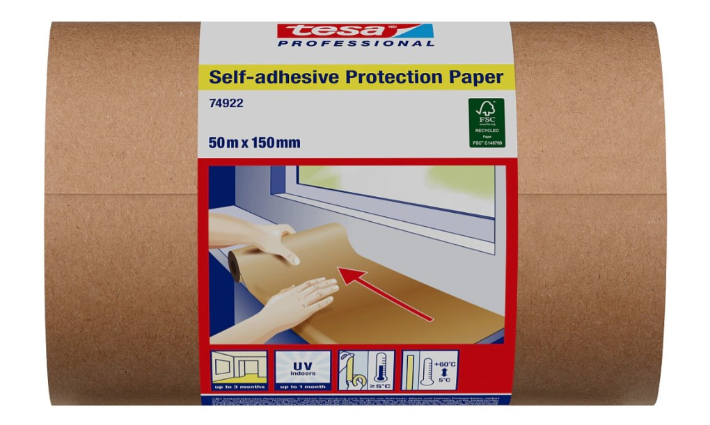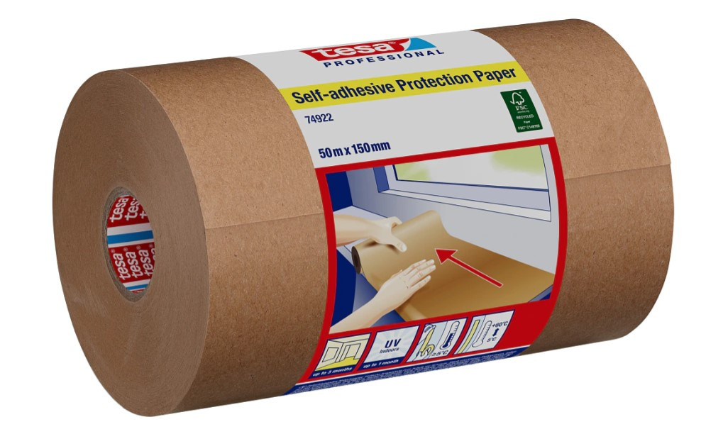 Tesa öntapadó védőpapír a gyors és tiszta, nagy felületű védelemhez és takaráshoz, 100%-ban újrahasznosított rostokból készült és FSC® tanúsítvánnyal rendelkezik.