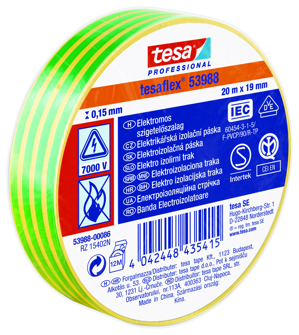 Az 53988 elektromos szigetelőszalag megbízható segítséget nyújt villanyszerelőknek, szerelőknek vagy más ezermestereknek. Vastag alapanyag, magasfokú rugalmasság és nagyon magas ragaszóerő jellemzi (még acélon illetve alacsony hőmérsékleten is). Ez a PVC szigetelőszalag nem csak szigetelésre és vezetékek megjelölésére alkalmas, de szereléshez és kötegeléshez is. Mivel rengeteg színben elérhető (piros, kék, fekete, fehér és zöld-sárga), jelölőszalagként is használható. A tesaflex® 53988 minden fontos tanúsítvánnyal rendelkezik és könnyen használható.