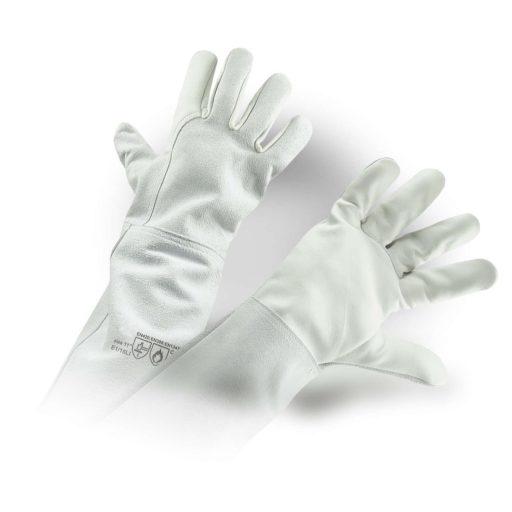 Munkavédelmi hegesztő kesztyű, melynek tenyéroldala válogatott juhbőrből készült. A kesztyű hossza 20 cm, mandzsetta része erős marhabőrből készült, kevlár fonallal varrva.