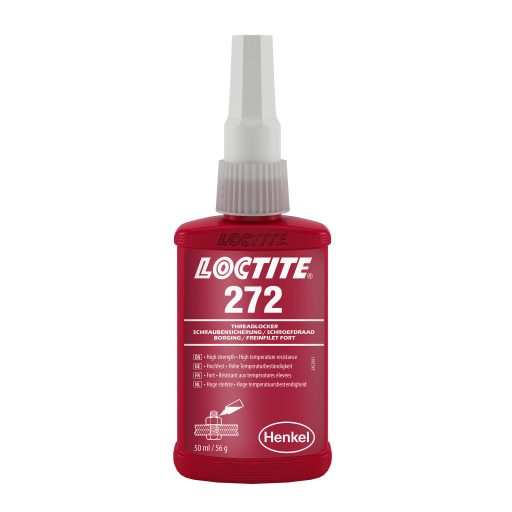 A Loctite 272 nagy szilárdságú, közepes viszkozitású, vörös színű, metakrilát bázisú csavarrögzítő termék. Jellemző rögzítési idők 10, 5 és 15 perc acélon, sárgarézen és rozsdamentes acélon. Ideális megoldás olyan alkalmazásokhoz, ahol a termék felvitel utáni elfolyását meg kell akadályozni. Ipari olajokkal enyhén szennyezetett felületeken is alkalmazható. Fém menetek rögzítésére alkalmas. Oldónyomaték M10 csavaron 23 Nm.